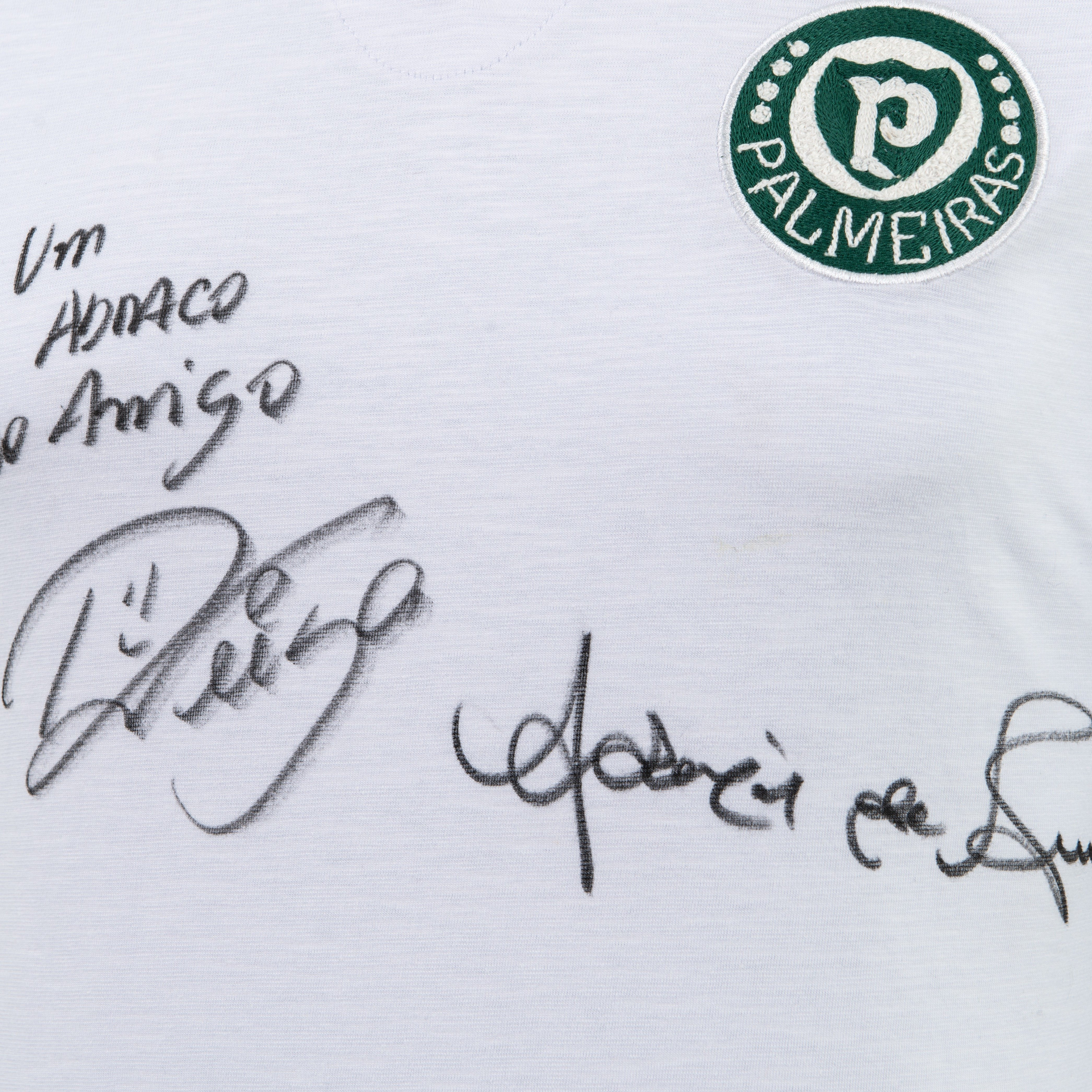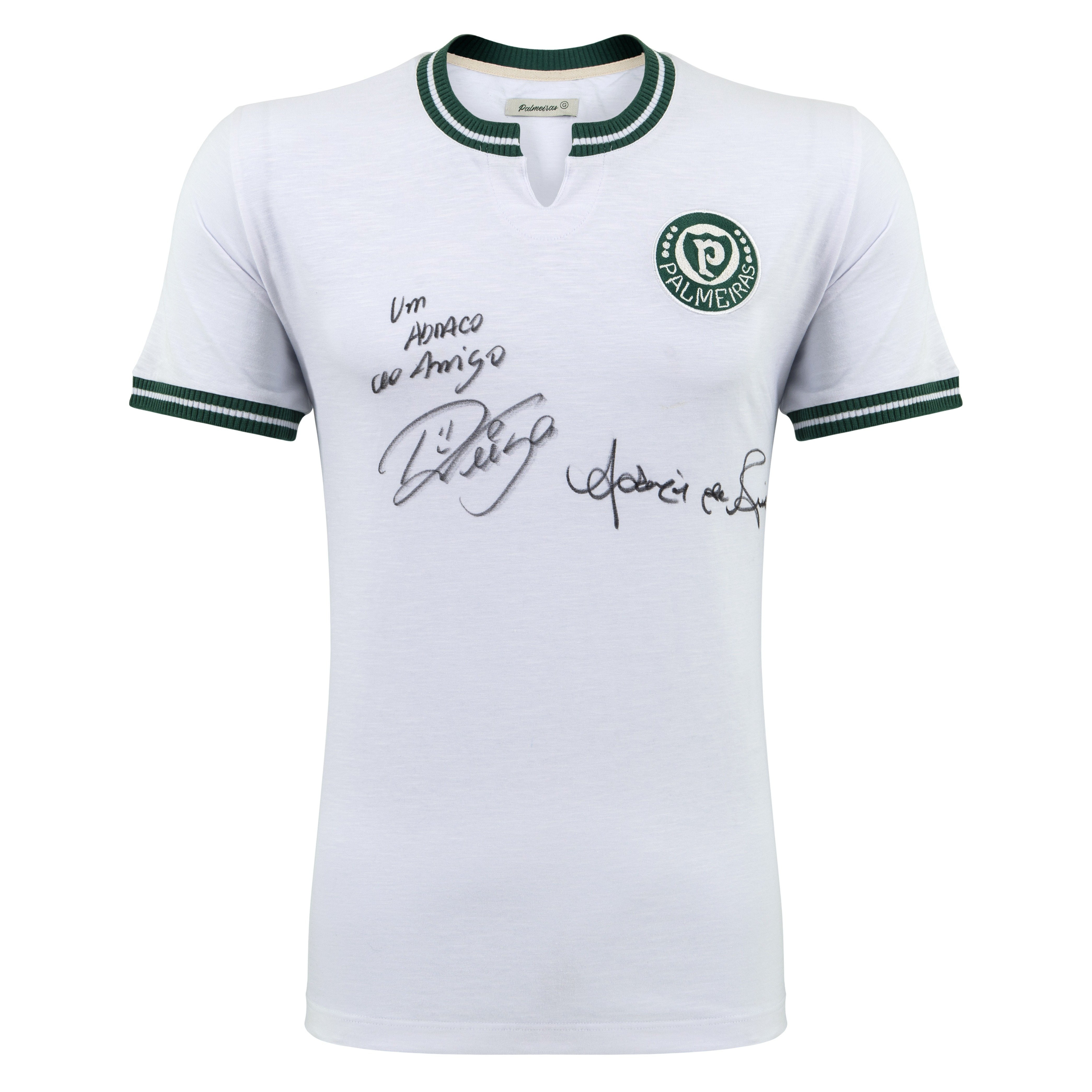 Esta camisa reúne assinaturas de dois grandes ídolos do clube, representando gerações distintas que marcaram a história alviverde: Ademir da Guia e Raphael Veiga.