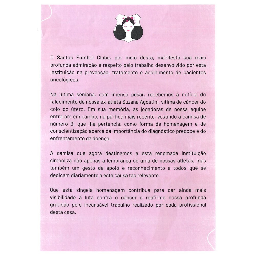 Em memória de Suzana Agostini, eterna Sereia da Vila e quarta maior artilheira da história do Santos FC, que nos deixou em decorrência de um câncer de colo do útero, será leiloada uma camisa autografada por todo o elenco da equipe feminina do Santos.