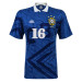 O modelo azul, com gola polo branca e detalhes em verde e azul, traz características clássicas da época, como escudo aveludado da CBF, numeração em feltro aplicada na frente e nas costas, além do tradicional tecido jacquard da Umbro.